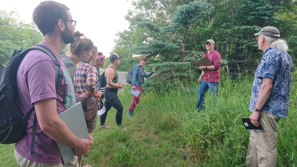 The group that traveled to Rock Pond and back had a specific interest in wild edibles and medicinal plants. Plants of note that fit that category included, the edible oyster mushroom growing on a dead aspen, wild bergamot by the pond which is used to make earl grey tea, and spotted touch-me-not (or jewel-weed) that is told will lessen the pain from a bee sting or stinging nettles. The plant community surrounding Rock Pond consisted of northern meadow, sun-loving plants, and aside from the medicinal and edible plants, many flowers were blooming, such as northern bedstraw, common milkweed which had a caterpillar on the plant, and golden alexanders which are the host plant of the black swallowtail butterfly. Along the trailside edges and down the historic run from the ski jump, many invasive species were noted, such as valerian and tansy which are both said to assist in sleep and plantain which is known as a substitute for an antibiotic in wounds. This was still fun to discuss their medicinal uses, which were likely the reason why many of them are here today.