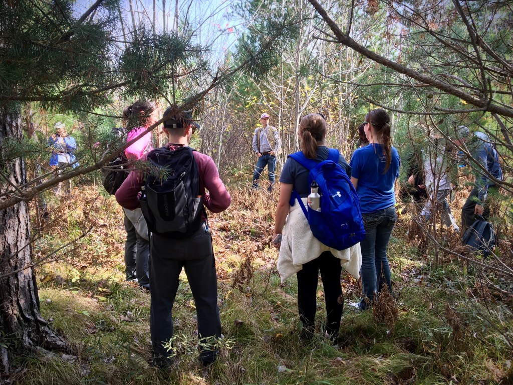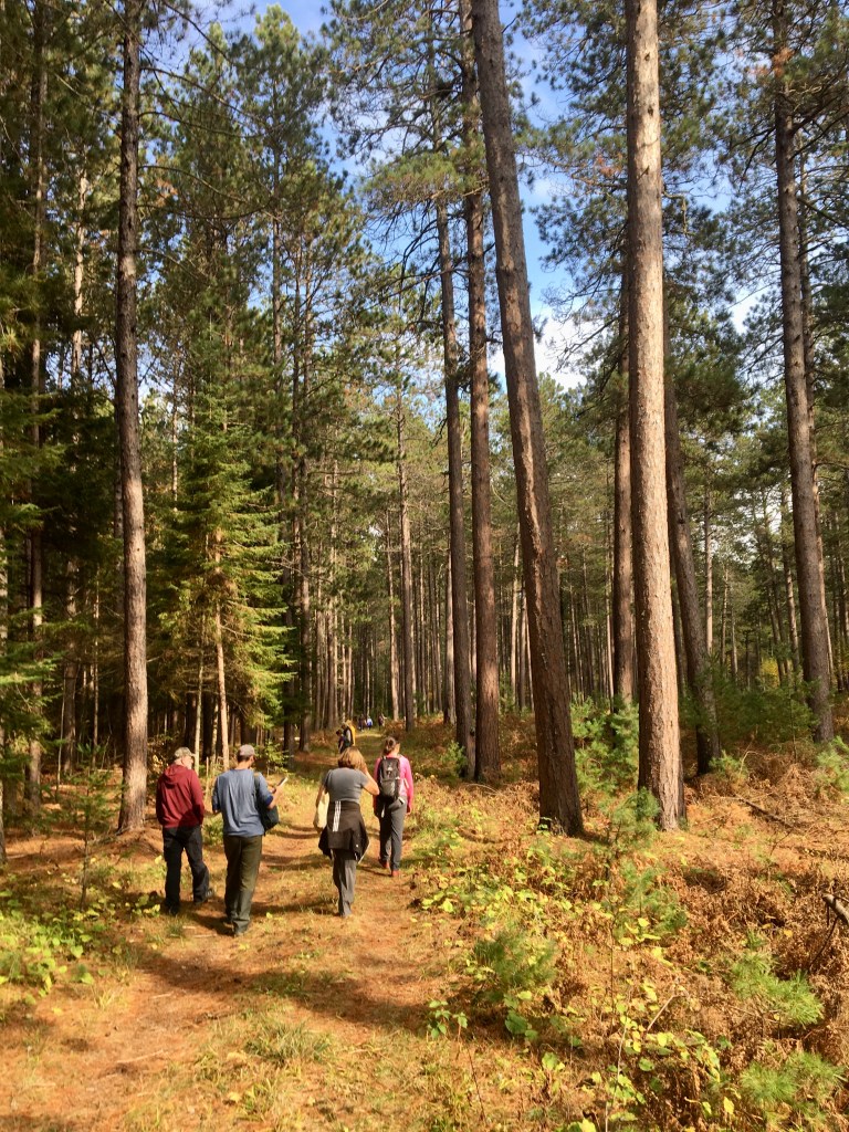 On an unseasonably warm October afternoon UMN forester, Kyle Gill, guided the Arrowhead Native Plant Explorers through early successional and late successional forests at the UMN Cloquet Forestry Center. These large stands of towering red, jack, and white pines had been spared from the catastrophic 1918 fire that swept through Cloquet and the surrounding region. The land has been managed by the University of Minnesota since 1909 for research and study. The property exists on traditional and ancestral lands and is within the Fond du Lac Reservation boundary.