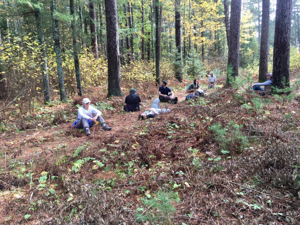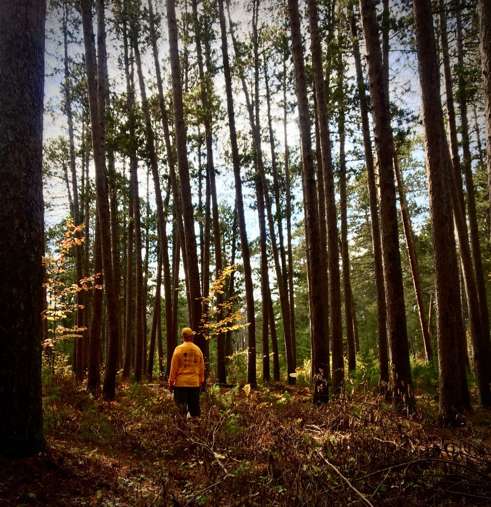The final stop for the group was a stand of massive red pines that germinated back in 1813-1820. These lone pines were excluded from harvest to exhibit an old growth pine stand and demonstrate that the value of a forest is in more than just the trunks of the trees. In an effort to prioritize gratitude rather than the colonizer mindset, Kyle encouraged the group to pause beneath the massive pines in silence and listen to the wind gently sieve through the pine boughs high above.