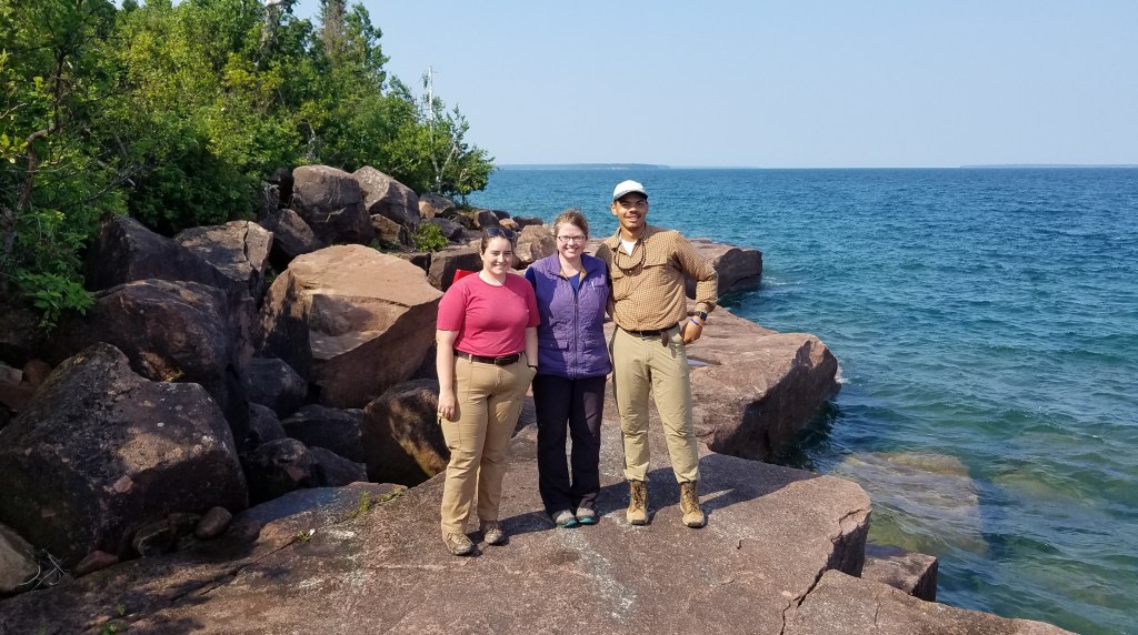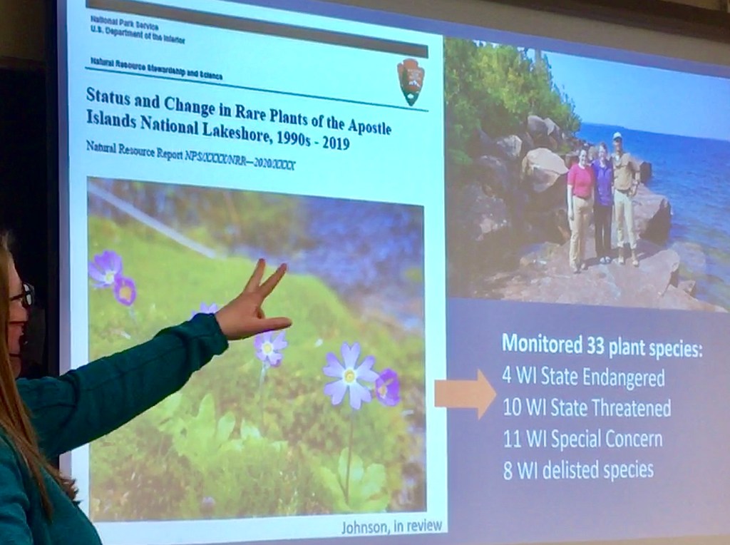 Wisconsin botanist Emmet Judziewicz surveyed the National Park lands for rare plants in the 1990s and again in the 2000s when the lake was very low. Dr. Johnson set out revisit all the populations he had documented and assess their status. She described her crew searching the rocks and bluffs for weeks at a time. They became quite adept at spotting particular plants perched on cliff faces with binoculars from a rocking boat.