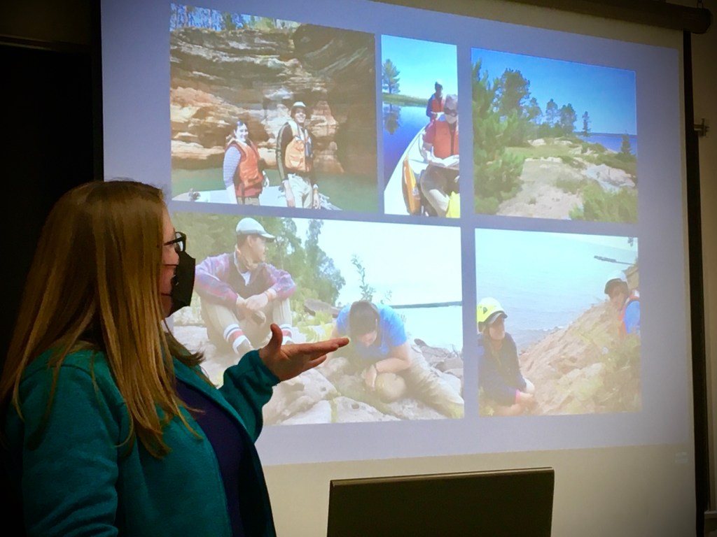 Dr. Johnson described the various habitats found along these island shorelines. At Isle Royal it is primarily basalt bedrock with crevices and pools that are repeatedly scoured by waves and ice. There are also bedrock shorelines in the Apostles, but of sandstone, often in cliffs. The Apostles also have eroding clay bluffs and some sand dunes on the quiet side of the islands, sometimes with wetland lagoons protected by sandspits.