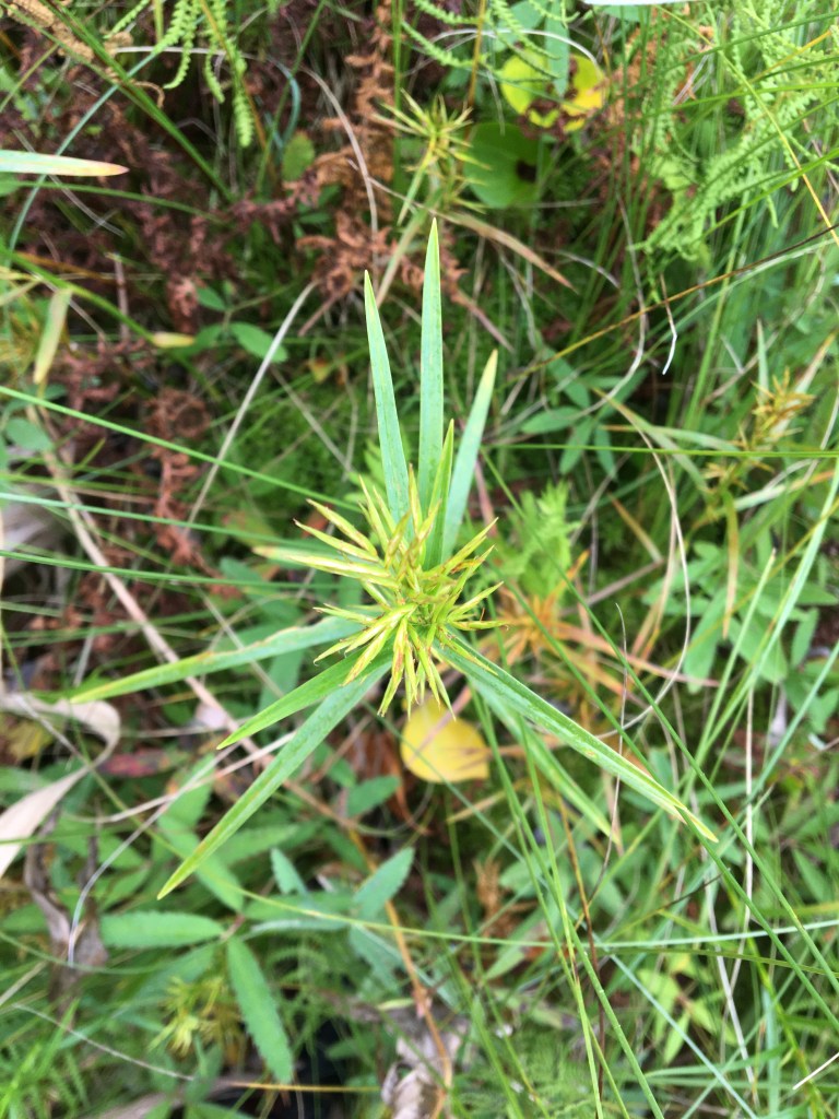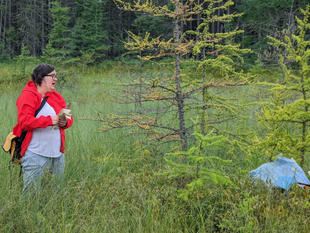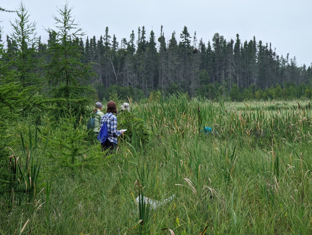 On Saturday, August 28, Arrowhead Native Plant Explorers held our first annual Plant Foray. The Forays are intended to provide the Olga Lakela Herbarium at UMD with fresh plant specimens for educational and research purposes. The morning showers ended, but our feet certainly got wet as we headed into the Blue Dasher Bog. Blue Dasher is one of the preserves owned by Friends of the Sax-Zim Bog in the extensive lowlands west of Cotton. Rubin Stenseng, who is on the board of both ANPE and FOSZB, welcomed us to the preserve. After following the trail through the shaded black spruce bog, we emerged into the open floating fen on the shore of East Stone Lake.