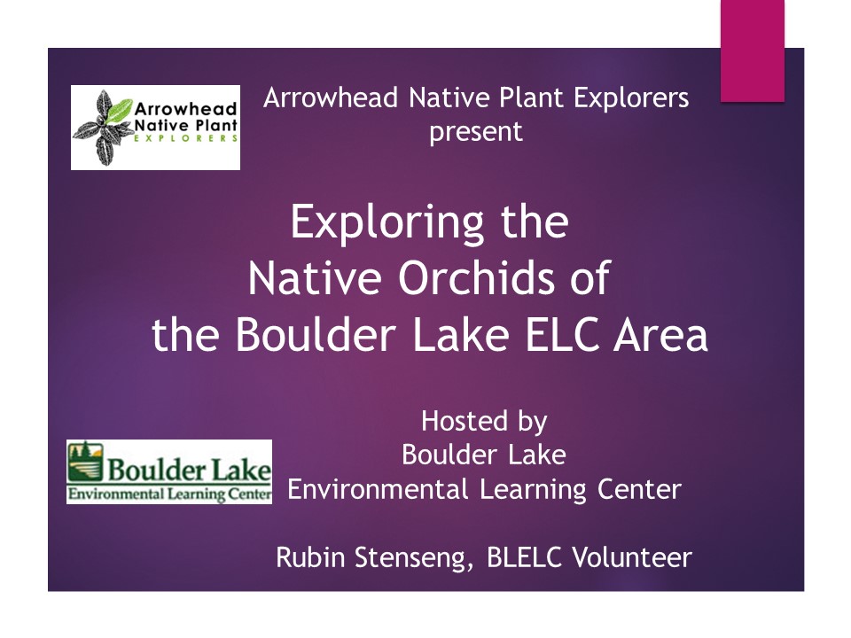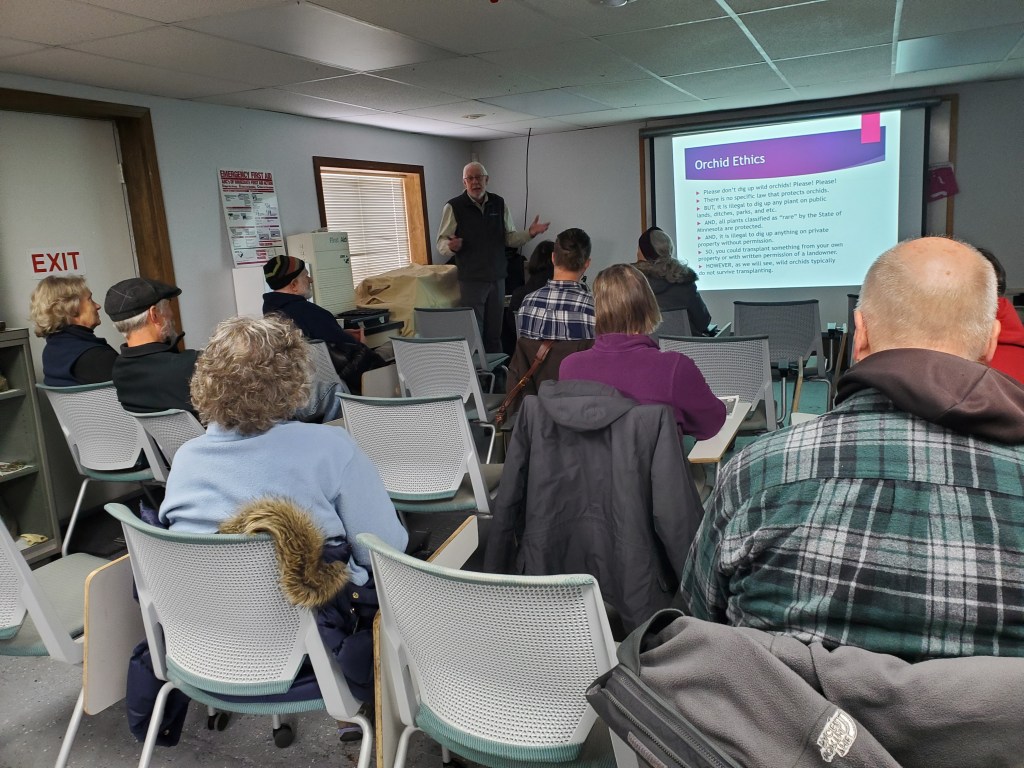 Our speaker was Rubin Stenseng, who is both treasurer for the Explorers and a volunteer/explorer at Boulder Lake. We learned all about the 49 species of orchids in Minnesota, which range in height from just a few inches up to 40 inches tall, and in flower color from green to yellow to pink. All orchid flowers have 3 petals, one of which is modified into all sorts of odd shapes and is called a “lip.” And all orchids require a fungal partner living in the soil. In fact their seeds are so miniscule that they can’t germinate at all without the fungus providing nutrients. As they grow, an active trade develops, sugars from the orchids exchanged for nutrients from the fungus. Digging up orchids often results in the death of the fungus, and ultimately the orchid too.