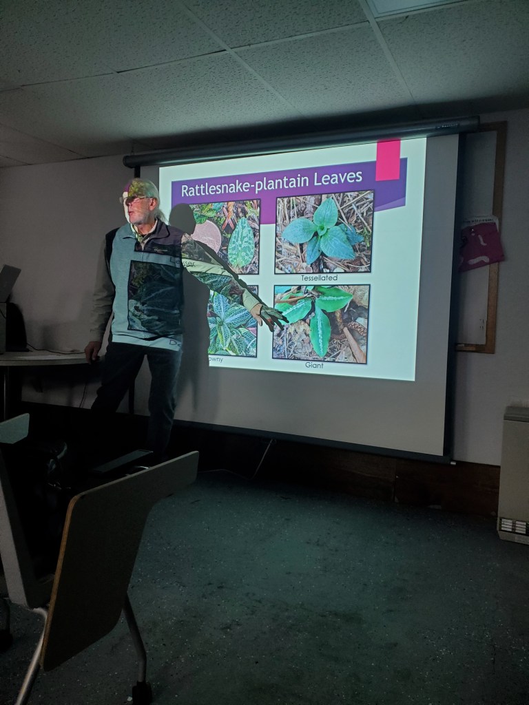 Rubin also described the two species of coral root orchids found at Boulder. These have little to no chlorophyll, and they rely completely on their fungal partner for survival. What the fungus receives in return is unknown. Many of our orchids are striking in appearance, including the gaudy purple fringed orchid and the downy rattlesnake plantains with its variegated leaves. Thanks to Rubin for such an in-depth discussion.