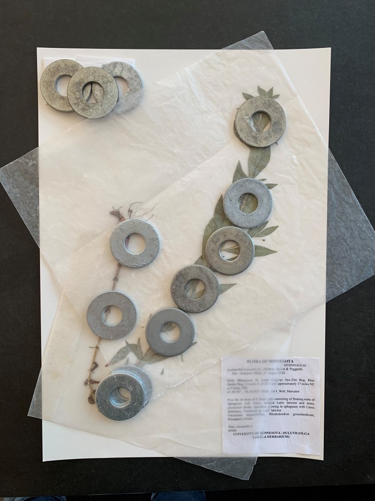 Under Dr. Grusz’s guidance, we worked through a stack of pressed plants that we collected at an event back in August at Sax-Zim Bog. We carefully glued them to herbarium sheets, making sure both the tops and undersides of leaves were visible. In the corner we attached a label with information about the plant, including the species name, the date and location it was collected, the name of the collector, and a unique collection number.