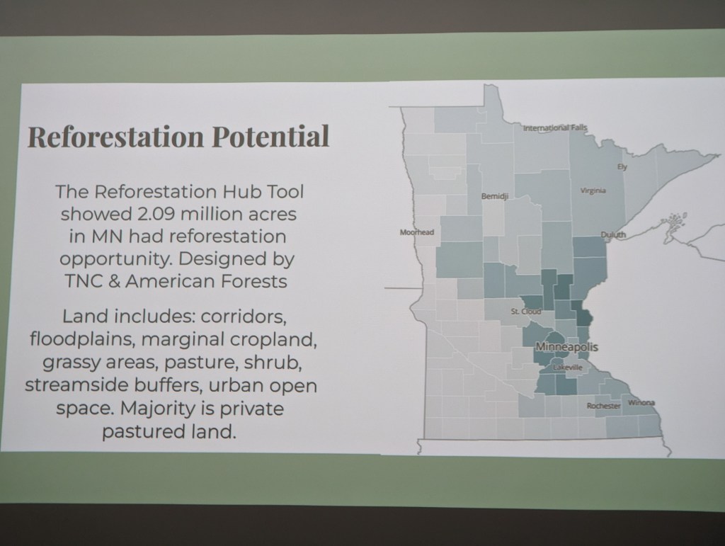 To explore the related goal of capturing atmospheric carbon, The Nature Conservancy, along with American Forests, developed the Reforestation Hub tool, which identified over 2 million acres of reforestation potential in Minnesota, mostly on private land. They set a goal of planting trees on 1 million of those acres, which would require over 43 million seedlings per year. Current production in Minnesota is 6 million. The Forest Assisted Migration Project aims to fill that tremendous gap.