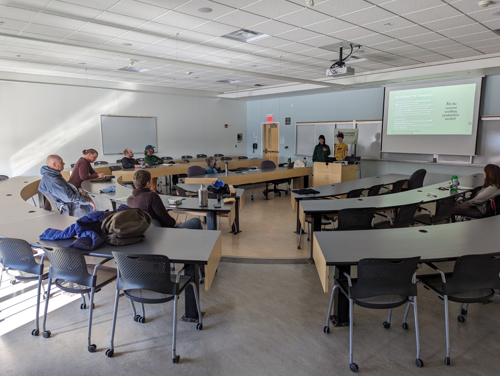 The group had a great discussion about the risks of moving genetics around and the desire to maintain some of our familiar boreal trees, which have cultural significance for indigenous people as well as the wider population. There is a partnership in Minnesota that aims to do that in places where the microclimate may allow them to hang on. Liv and Sydney continue the seedling production project by training students in seed collection and using a new grant to increase refrigeration capacity and improve their seedling tracking database. Soon we hope to see growers producing millions of seedlings for new expanded tree-planting programs.