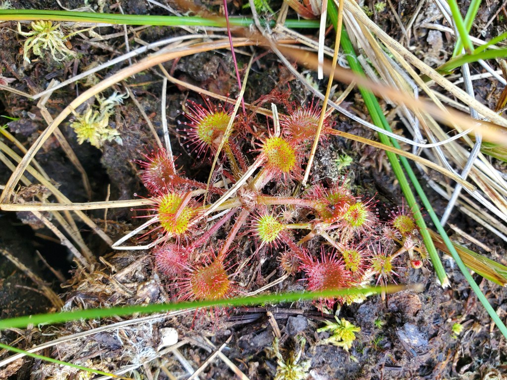 From the Welcome Center we headed out a boardwalk into a bog of stunted black spruce. When we found plants in flower or in fruit, if the population was robust enough, we selected one to dig up by the roots with a trowel or soil knife. One of the highlights was round-leaved sundew, which had dark seed pods on stalks rising a few inches from their tiny red basal leaves.