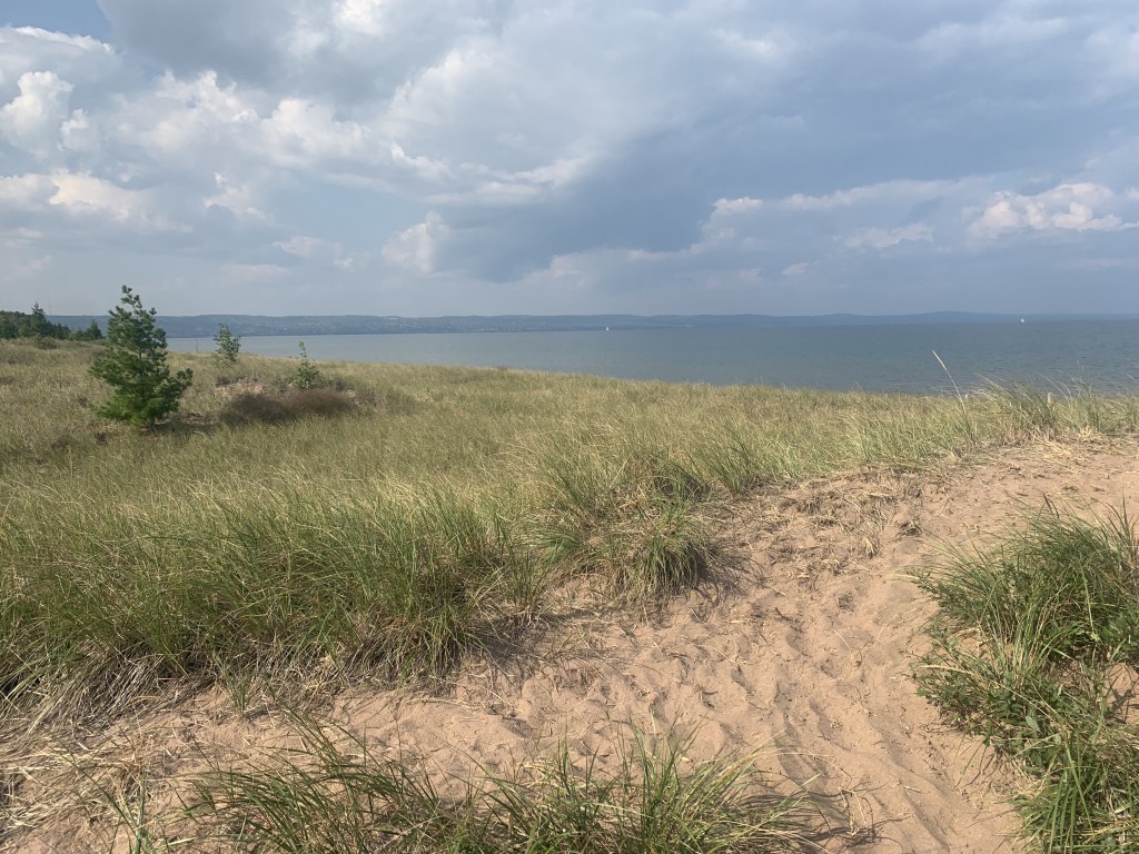 We crested the primary dune and descended to the beach face, where a pleasant breeze came off the sailboat-studded lake. Rebecca described how a coastal current carries sand westward along the lakeshore and deposits it on the beach. The jetties at the Superior Entry now capture much of it, starving the rest of the beach of its most basic building blocks, which contributes to erosion during storms. Waves, wind, and ice scour all make the beach face a highly unstable environment, where only a few plants can gain a temporary root-hold. It’s also home to the species with the wildest name we heard all day: the endangered Rhode Island hairy-necked tiger beetle (Cincidela hirticollis spp. rhodensis).