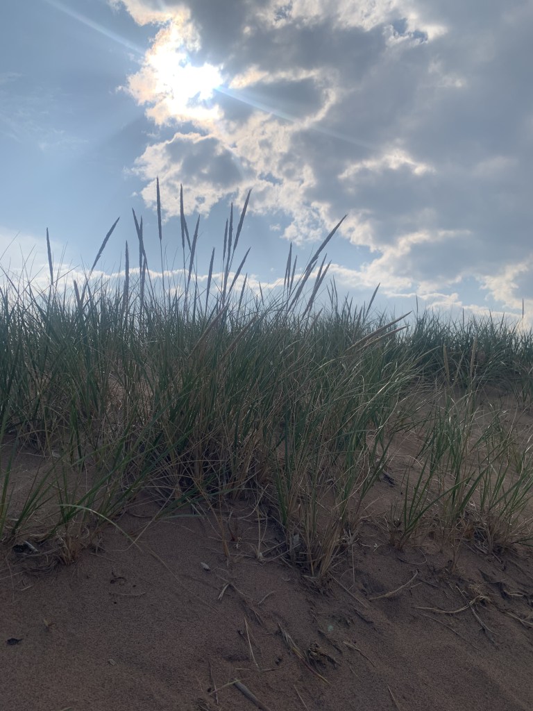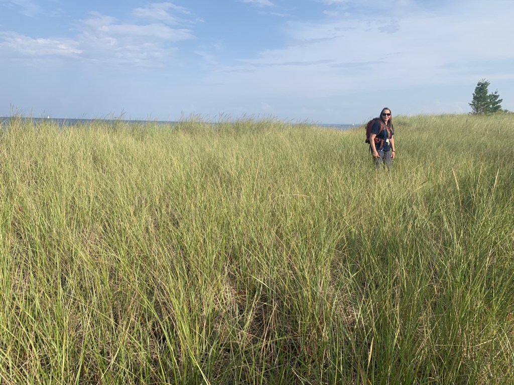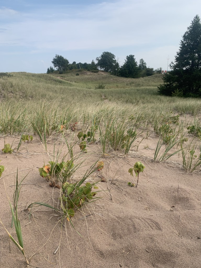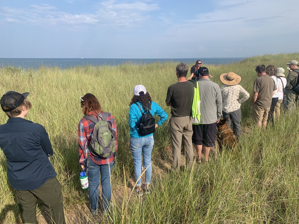 After leading us down a dune path, Rebecca asked what differences we noticed. Observant group that we are, people reported the beach grass was taller and denser—so dense that few other species could wiggle in. We had entered a patch that had spread from a nearby dune restoration decades ago. Past restorations have used commercial beachgrass material sourced from Michigan, which has been found to be taller, to spread faster, and to have a different flowering phenology than plants from Minnesota. Restoration projects now used local vegetative propagules.
