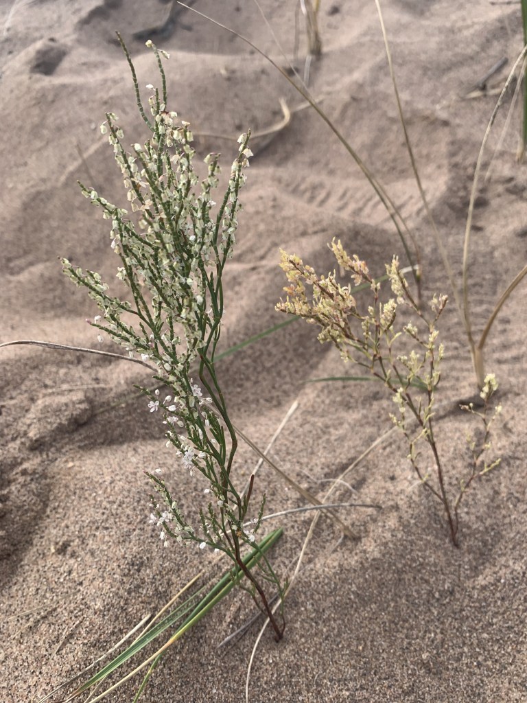 Growing in among the beach grass were a few other plants adapted to the harsh conditions, including the rare beach heather (Hudsonia tomentosa). Rare and specialized plants find a home in the dunes because the more common species that would outcompete them in a rich loam (for example) can’t hack it at the beach. But some non-native species can. We saw some clumps of baby’s breath (Gypsophila paniculata), likely escaped from someone’s garden long ago.