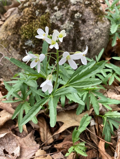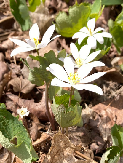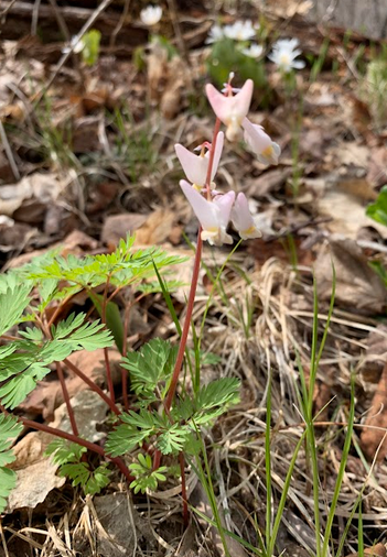 As we continued, we were lucky to see a couple patches of bloodroot (Sanguinaria canadensis) still flowering and cutleaf toothwort (Cardamine concatenata), as well as the very first bellworts of the year, both large-flowered (Uvularia grandiflora) and sessile-leaved (U. sessilifolia). When we reached a few Dutchman’s breeches plants (Dicentra cucullaria), with tiny white pantaloons thrust above their finely-dissected leaves, it was time to call it a success and head back to the cars.