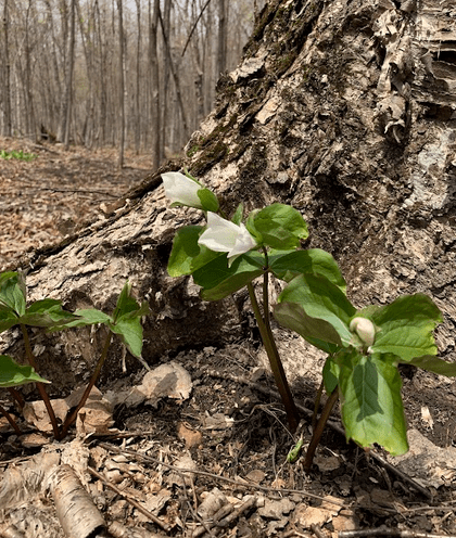 When we embarked up the trail, we quickly saw large-flowered trillium (Trillium grandiflora), mostly still in bud, but a few already open. Some hepatica (Hepatica americana), which bloom even earlier, still showed their tiny lavender petals. We stopped along the trail to talk about the four patches of old-growth forest in the Natural Area, defined as having some trees over 120 years old. When some of the old-growth was slated to become a golf course in the early 2000s, the effort to protect the forest resulted in the creation of the Duluth Natural Area Program, with Magney-Snively its first inductee. As we stood there, we also began to talk about one of the small understory trees around us: ironwood (Ostrya virginiana). As always happens on our walks, we all shared our knowledge, including the use of ironwood for the frames of waaginogaan lodges.