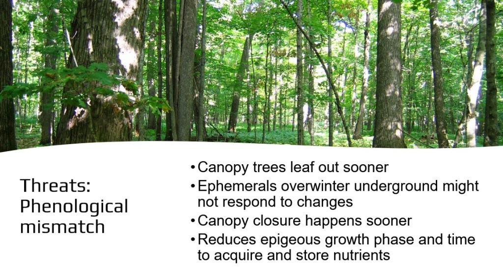 For such tiny plants, ephemerals actually have high impacts on our environment. They are an early source of pollen and nectar for native insects. Their high water demand reduces runoff and nutrient loss and can lead to decreased erosion. Ephemerals also face many threats, including invasive species, earthworms, habitat loss, and a warming climate that they cannot respond to as quickly as other species, creating phenological mismatches.