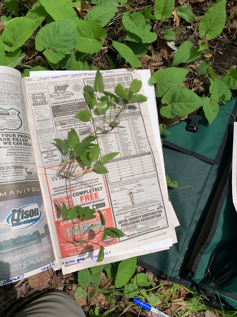 Altogether we collected about 90 plant specimens for Paul’s project and the herbarium. These included many invasive species like hawkweed (Hieracium spp.) and honeysuckle (Lonicera spp.), but also many natives like serviceberry (Amelanchier spp.), chokecherry (Prunus virginiana), yarrow (Achillea millefolium), false melic grass (Schizachne purpurascens), and false Solomon’s seal (Maiathemum racemosum).