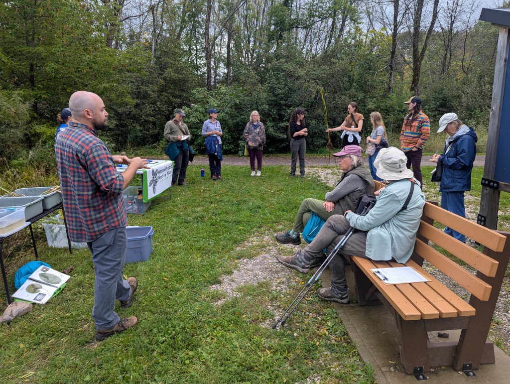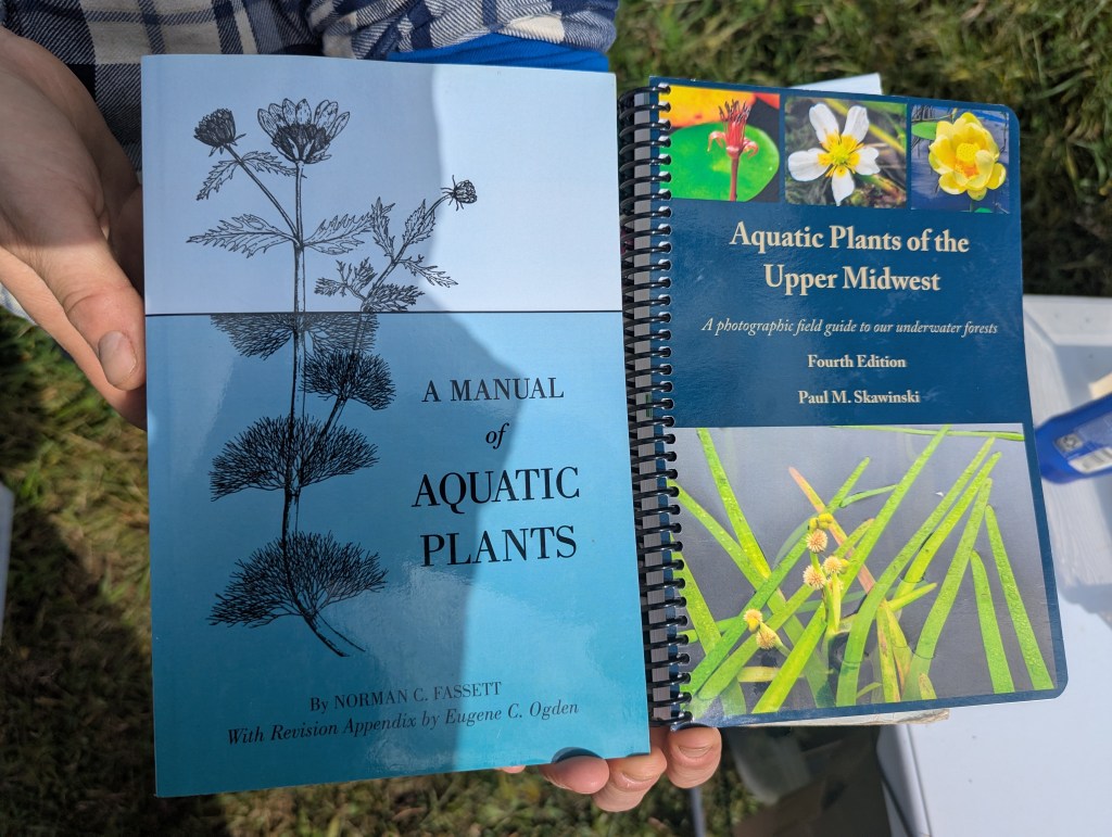 Reed, a botanical researcher at the UWS Lake Superior Research Institute, set up two plant identification stations for us, one at our meeting spot at the Kingsbury Creek Restoration kiosk and another overlooking the bay. At each station were numerous examples of plants Reed had collected for us, including tubs of water for submerged species so we could see their aquatic growth forms. He also had field guides with illustrations, and he even donated a copy of Skawinski’s Manual of Aquatic Plants to ANPE’s lending library.
