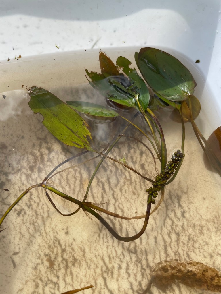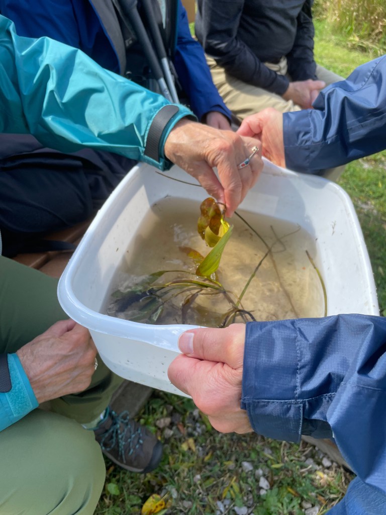 Reed divided aquatic plants into three categories based on water depth: wetland, emergent, and submerged. At the first station we began with a variety of wetland and emergent species, and we were able to handle all of them for a close look. One familiar emergent is cattail (apakweyashkway, Typha spp.). There is a native broadleaf cattail (Typha latifolia) in Minnesota, but the most abundant type (Typha glauca) is a hybrid with a non-native species. The hybrid can take over large areas that have experienced some disturbance.