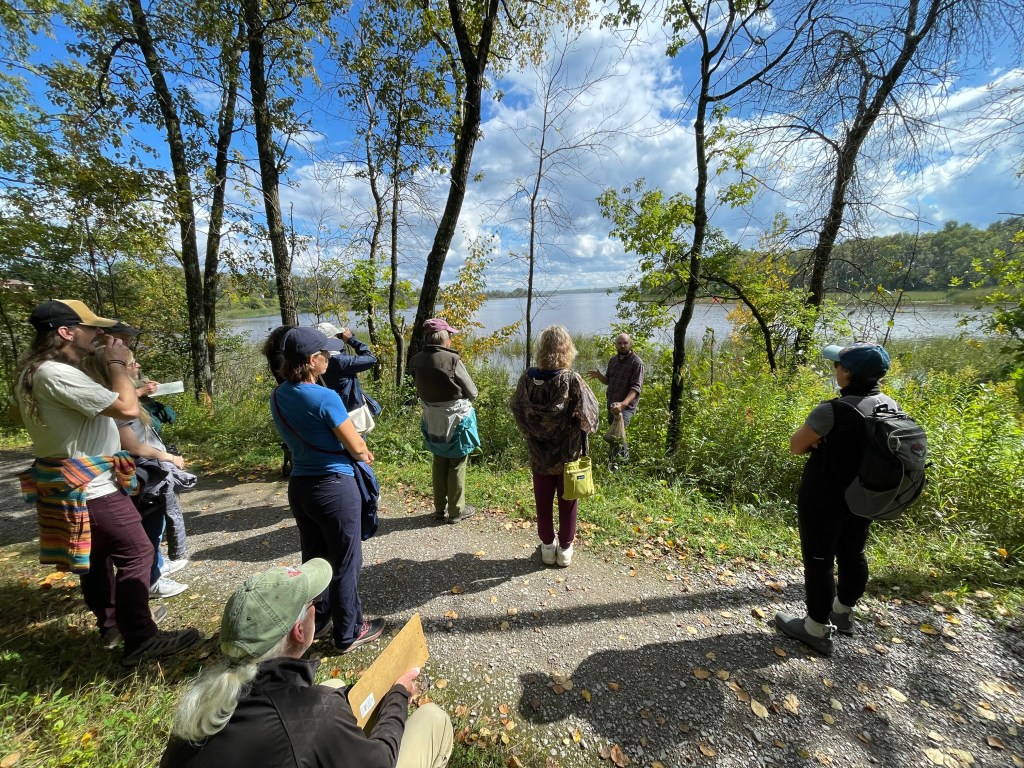 On the short walk to the second station Reed described the restoration of the bay, which involved excavating large amounts of sediment, along with most of the hybrid cattails. Afterward, in the now deeper water, manoomin was re-introduced to the habitat where its abundance once sustained Dakota and Ojibwe villages both nutritionally and spiritually before industrial development eradicated it. On the north side of the bay the rice is well-established and expanding out from the shoreline. On the south side there are still fenced exclosures to protect it from foraging geese while the bed gets established.