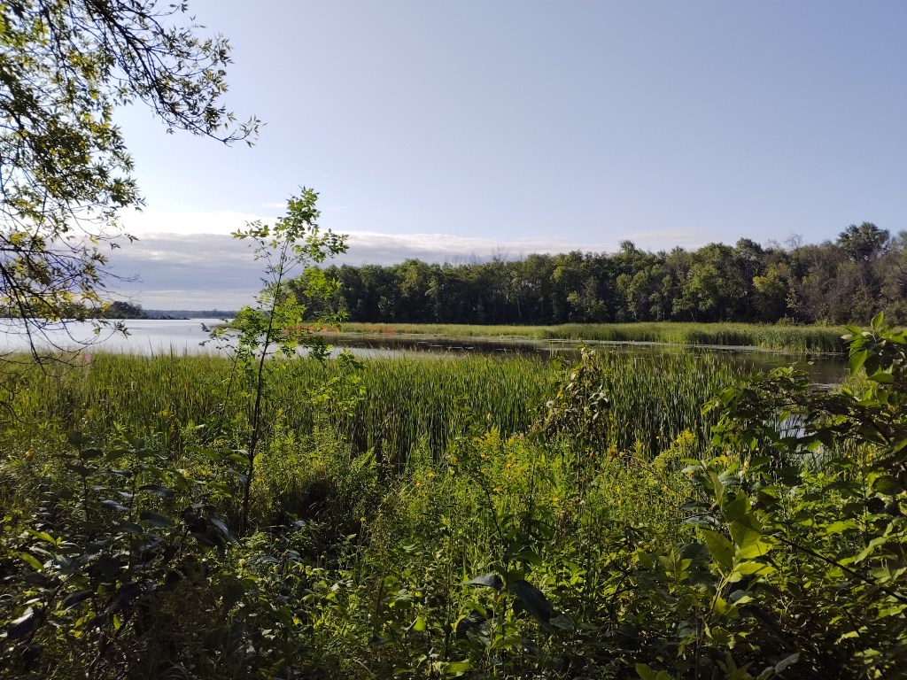 Walking the Waabizheshikana trail in western Duluth as the threat of rain faded, we had a view across the open water of Kingsbury Bay. Patches of manoomin (wild rice, Zizania palustris) ringed the edges. Reed Schwarting, who led our session on aquatic plant identification, explained that only 10 years ago this bay looked completely different. Instead of open water with submerged aquatic plants, we would have seen a solid expanse of hybrid cattail growing on deep deposits of excess sediment carried in by Kingsbury Creek.