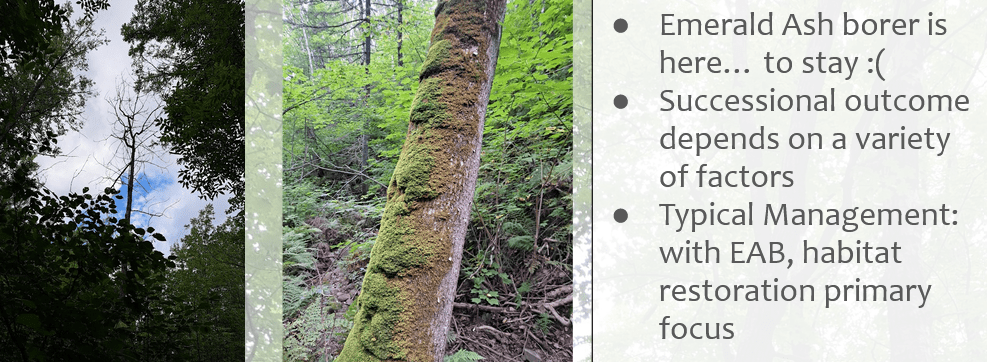 Black ash forests are being decimated by emerald ash borer, especially in the Lester-Amity area. In places were the ash is mixed with aspen, balsam poplar, red maple, or conifers, these other trees can take its place. In some wetter spots planting flood-tolerant tree species may be necessary, or they can be left to transition into shrub swamps.