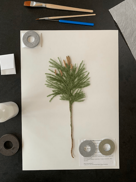 We arranged the plants on the sheets in a pleasing manner and brushed glue onto one side of them. Heavy washers prevented stems and leaves from lifting off the paper until the glue dried. Some plants, like shrub branches and sedges, are easier to mount with adhesive strips. The stack I worked on included a couple large sedges that I had to wrangle onto the page like roping a steer.